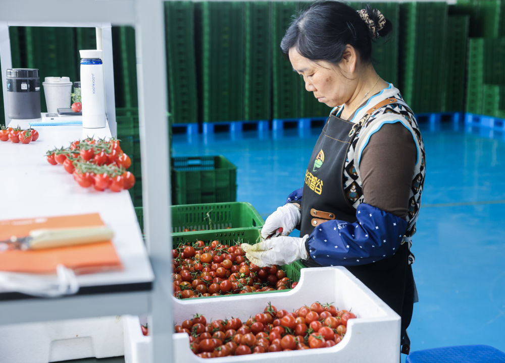 4月15日,村民在位于浙江省海宁市黄湾镇的浙江光禾智谷生态农业有限公司车间内分拣、打包刚采摘下来的番茄。近年来,海宁市积极推进乡村片区组团发展,助力乡村振兴。新华社记者徐昱 摄