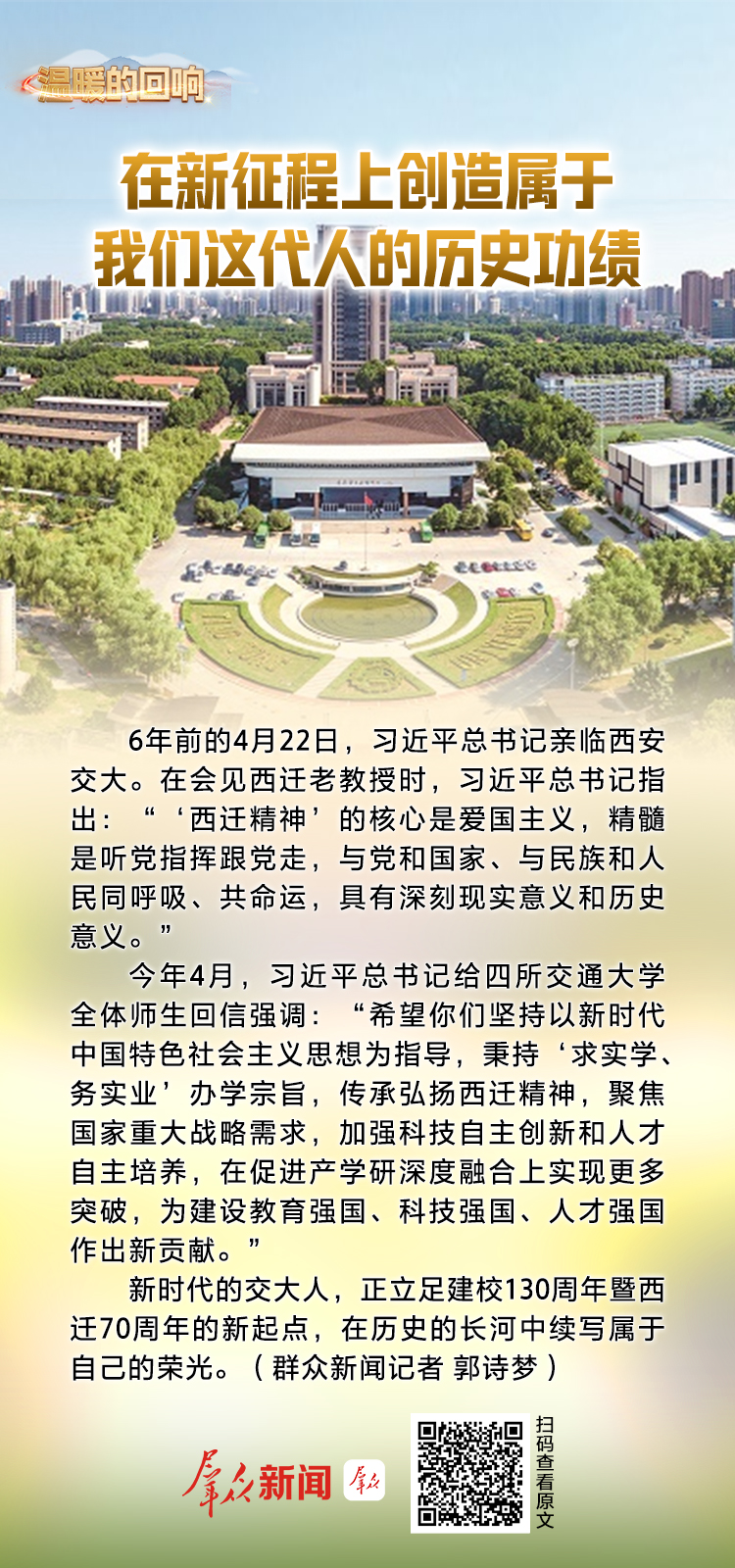 新时代的交大人,正立足建校130周年暨西迁70周年的新起点,在历史的长河中续写属于自己的荣光。
